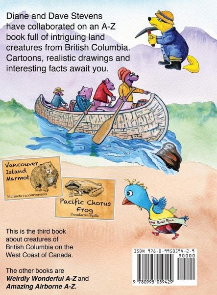 What does an ant lion or a rubber boa look like? If you've never seen one you might imagine an ant and a lion combined or a very elastic snake. Eccentric Earthlings brings these creatures to life. Immerse yourself in Diane and Dave's funny and factual world in this informative alphabet book. Each creature is shown as an imaginative cartoon accompanied by the scientific name, some facts and a realistic drawing of what they look like. You will be entertained as you see different land creatures from British Columbia and you will learn about them.