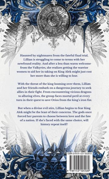 Haunted by nightmares from the fateful final trial, Lillian is struggling to come to terms with her newfound reality. And after a less than warm welcome from the Valkyries, she realizes getting the warrior women to aid her in taking on King Alek might just cost her more than she is willing to lose. With the threat of the king looming over them, Lillian and her friends embark on a dangerous journey to seek allies in their fight. From encountering vicious dragons to alluring elves, the group faces mortal peril at every turn in their quest to save Orios from the king's iron fist. But when a divine evil stirs, Lillian begins to fear King Alek might be the least of their concerns. The gods once forced her parents to choose between love and the fate of a nation. If she's faced with the same choice, will history repeat itself?