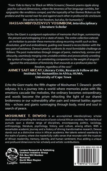 "From 'Ode to Harry' to 'Black on White Screams, Dewoo's poems ripple along psycho-cultural dimensions, where the terseness of her language rumbles, her epigraphic-like renditions compel, and the topicality of her themes flickers as the profane and the sacred roar for and against each other in profound dis-enclosure. She writes for her freedom, but also, for humanity's." HASSAN MBIYDZENYUY YOSIMBOM, Interdisciplinary Literature Scholar "Echo the Giant is a poignant exploration of memories that linger, summoning the present and entrapping it in a state of stasis. The entire collection extends an invitation to ponder these memories along recurring motifs such as fear, dissolution, grief and embodiment, guiding one toward a reconciliation with the very pain of existence. Dewoo's poetry confronts its most formidable challenge as follows: The past materialises through images of panic, melancholy, sorrow and obscurity, seamlessly merging into unstable entities and provocatively unveiling the syntax of incapacity - an unrelenting companion to the weight of anguish against the articulation of femininity that resounds as a profound plea for freedom, regardless of the cost." AHMET SAIT AKCAY, Literary Critic, Research Fellow at the Institute for Humanities in Africa, HUMA, University of Cape Town Echo the Giant marks the fifth chapter of Moshumee T. Dewoo's poetic odyssey. It is a journey into a world where memories pulse with life, emotions cascade like melodies, the ordinary becomes extraordinary, and words become the prism refracting the light of our shared brokenness or our vulnerability after pain and internal battles against this - echoes and giants rummaging through body, mind and soul in search of peace.