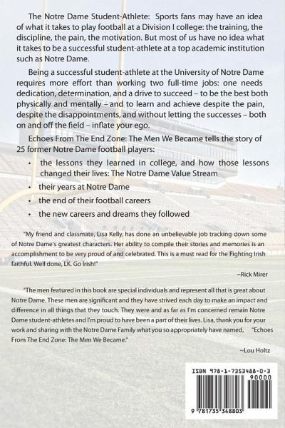 The Notre Dame Student-Athlete: Sports fans may have an idea of what it takes to play football at a Division I college: the training, the discipline, the pain, the motivation. But most of us have no idea what it takes to be a successful student-athlete at a top academic institution such as Notre Dame. Being a successful student-athlete at the University of Notre Dame requires more effort than working two full-time jobs: one needs dedication, determination, and a drive to succeed - to be the best both physically and mentally - and to learn and achieve despite the pain, despite the disappointments, and without letting the successes - both on and off the field -inflate your ego. Echoes From The End Zone: The Men We Became tells the story of 25 former Notre Dame football players: ¿ the lessons they learned in college, and how those lessons changed their lives: The Notre Dame Value Stream ¿ their years at Notre Dame ¿ the end of their football careers ¿ the new careers and dreams they followed