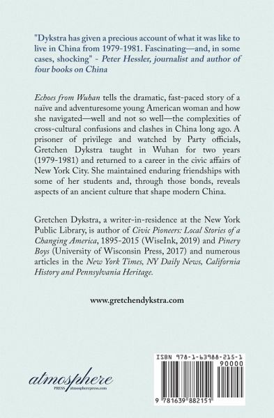 "An engaging and illuminative remembrance." - Kirkus Reviews Echoes from Wuhan tells the dramatic, fast-paced story of a naïve and adventuresome young American woman and how she navigated-well and not so well--the complexities of cross-cultural confusions and clashes in China long ago. A prisoner of privilege and watched by Party officials, Gretchen Dykstra stayed in Wuhan for two years and returned to a career in the civic affairs of New York City. She maintained enduring friendships with some of her students and, through those bonds, reveals aspects of an ancient culture that shaped modern China. Gretchen Dykstra, a writer-in-residence at the New York Public Library, is author of Civic Pioneers: Local Stories of a Changing America, 1895-2015 (WiseInk, 2019) and Pinery Boys (University of Wisconsin Press, 2017) and numerous articles in the New York Times, NY Daily News, California History and Pennsylvania Heritage.