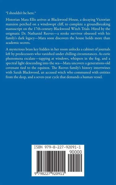 *I shouldn't be here.* Historian Mara Ellis arrives at Blackwood House, a decaying Victorian mansion perched on a windswept cliff, to complete a groundbreaking manuscript on the 17th-century Blackwood Witch Trials. Hired by the enigmatic Dr. Nathaniel Reeves-a stroke survivor obsessed with his family's dark legacy-Mara soon discovers the house holds more than academic secrets. A mysterious brass key hidden in her room unlocks a cabinet of journals left by predecessors who vanished under chilling circumstances. As eerie phenomena escalate-tapping at windows, whispers in the fog, and a spectral light descending into the sea-Mara uncovers a generations-old covenant tied to the equinox. The Reeves family's history intertwines with Sarah Blackwood, an accused witch who communed with entities from the deep, and a seven-year cycle that demands a human vessel. Caught between Dr. Reeves's cryptic warnings, his daughter Caroline's chilling pragmatism, and visions of a shadowy figure named Sophia, Mara must confront a truth that blurs the line between delusion and reality. Is Blackwood House a gateway to ancient forces, or a labyrinth of psychological manipulation? As the equinox looms, Mara's choices will determine whether she becomes a bridge between worlds-or the next victim of a legacy written in silence.