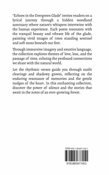 "Echoes in the Evergreen Glade" invites readers on a lyrical journey through a hidden woodland sanctuary where nature's whispers intertwine with the human experience. Each poem resonates with the tranquil beauty and vibrant life of the glade, painting vivid images of trees standing sentinel and soft moss beneath our feet. Through immersive imagery and emotive language, the collection explores themes of love, loss, and the passage of time, echoing the profound connections we share with the natural world. Let the rhythmic verses guide you through sunlit clearings and shadowy groves, reflecting on the enduring resonance of memories and the gentle nudges of the heart. In this enchanting collection, discover the power of silence and the stories that await in the notes of an ever-growing forest.