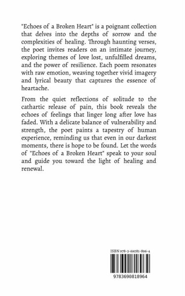 "Echoes of a Broken Heart" is a poignant collection that delves into the depths of sorrow and the complexities of healing. Through haunting verses, the poet invites readers on an intimate journey, exploring themes of love lost, unfulfilled dreams, and the power of resilience. Each poem resonates with raw emotion, weaving together vivid imagery and lyrical beauty that captures the essence of heartache. From the quiet reflections of solitude to the cathartic release of pain, this book reveals the echoes of feelings that linger long after love has faded. With a delicate balance of vulnerability and strength, the poet paints a tapestry of human experience, reminding us that even in our darkest moments, there is hope to be found. Let the words of "Echoes of a Broken Heart" speak to your soul and guide you toward the light of healing and renewal.