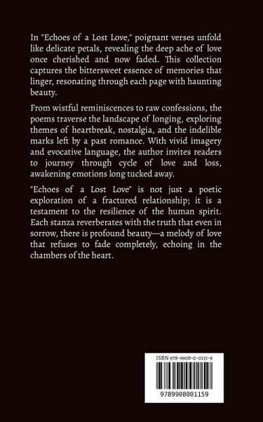 In "Echoes of a Lost Love," poignant verses unfold like delicate petals, revealing the deep ache of love once cherished and now faded. This collection captures the bittersweet essence of memories that linger, resonating through each page with haunting beauty. From wistful reminiscences to raw confessions, the poems traverse the landscape of longing, exploring themes of heartbreak, nostalgia, and the indelible marks left by a past romance. With vivid imagery and evocative language, the author invites readers to journey through cycle of love and loss, awakening emotions long tucked away. "Echoes of a Lost Love" is not just a poetic exploration of a fractured relationship; it is a testament to the resilience of the human spirit. Each stanza reverberates with the truth that even in sorrow, there is profound beauty-a melody of love that refuses to fade completely, echoing in the chambers of the heart.