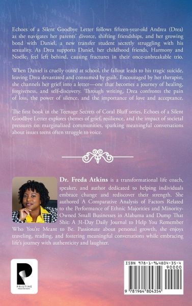 Echoes of a Silent Goodbye Letter follows fifteen-year-old Andrea (Drea) as she navigates her parents' divorce, shifting friendships, and her growing bond with Daniel, a new transfer student secretly struggling with his sexuality. As Drea supports Daniel, her childhood friends, Harmony and Noelle, feel left behind, causing fractures in their once-unbreakable trio. When Daniel is cruelly outed at school, the fallout leads to his tragic suicide, leaving Drea devastated and consumed by guilt. Encouraged by her therapist, she channels her grief into a letter-one that becomes a journey of healing, forgiveness, and self-discovery. Through writing, Drea confronts the pain of loss, the power of silence, and the importance of love and acceptance. The first book in the Teenage Secrets of Coral Bluff series, Echoes of a Silent Goodbye Letter explores themes of grief, resilience, and the impact of societal pressures on marginalized communities, sparking meaningful conversations about issues teens often struggle to voice.