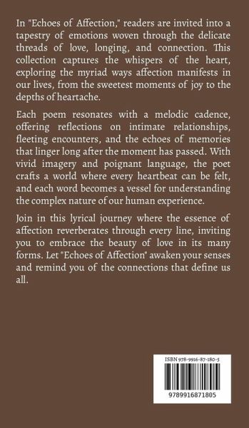 In "Echoes of Affection," readers are invited into a tapestry of emotions woven through the delicate threads of love, longing, and connection. This collection captures the whispers of the heart, exploring the myriad ways affection manifests in our lives, from the sweetest moments of joy to the depths of heartache. Each poem resonates with a melodic cadence, offering reflections on intimate relationships, fleeting encounters, and the echoes of memories that linger long after the moment has passed. With vivid imagery and poignant language, the poet crafts a world where every heartbeat can be felt, and each word becomes a vessel for understanding the complex nature of our human experience. Join in this lyrical journey where the essence of affection reverberates through every line, inviting you to embrace the beauty of love in its many forms. Let "Echoes of Affection" awaken your senses and remind you of the connections that define us all.