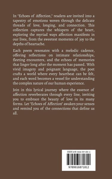 In "Echoes of Affection," readers are invited into a tapestry of emotions woven through the delicate threads of love, longing, and connection. This collection captures the whispers of the heart, exploring the myriad ways affection manifests in our lives, from the sweetest moments of joy to the depths of heartache. Each poem resonates with a melodic cadence, offering reflections on intimate relationships, fleeting encounters, and the echoes of memories that linger long after the moment has passed. With vivid imagery and poignant language, the poet crafts a world where every heartbeat can be felt, and each word becomes a vessel for understanding the complex nature of our human experience. Join in this lyrical journey where the essence of affection reverberates through every line, inviting you to embrace the beauty of love in its many forms. Let "Echoes of Affection" awaken your senses and remind you of the connections that define us all.