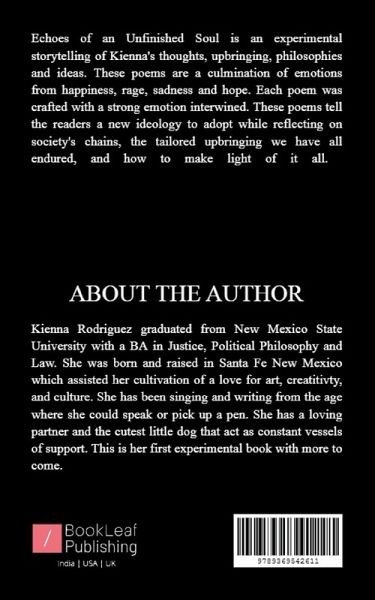 Echoes of an Unfinished Soul is an experimental storytelling of Kienna's thoughts, upbringing, philosophies, and ideas. These poems are a culmination of emotions from happiness, rage, sadness and hope. Each poem was crafted with a strong emotion intertwined. These poems tell the readers a new ideology to adopt while reflecting on society's chains, the tailored upbringing we have all endured, and how to make light of it all.