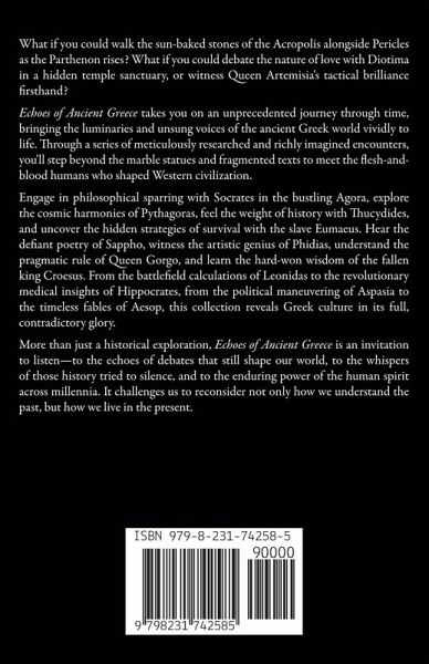 What if you could walk the sun-baked stones of the Acropolis alongside Pericles as the Parthenon rises? What if you could debate the nature of love with Diotima in a hidden temple sanctuary, or witness Queen Artemisia's tactical brilliance firsthand? Echoes of Ancient Greece takes you on an unprecedented journey through time, bringing the luminaries and unsung voices of the ancient Greek world vividly to life. Through a series of meticulously researched and richly imagined encounters, you'll step beyond the marble statues and fragmented texts to meet the flesh-and-blood humans who shaped Western civilization. Engage in philosophical sparring with Socrates in the bustling Agora, explore the cosmic harmonies of Pythagoras, feel the weight of history with Thucydides, and uncover the hidden strategies of survival with the slave Eumaeus. Hear the defiant poetry of Sappho, witness the artistic genius of Phidias, understand the pragmatic rule of Queen Gorgo, and learn the hard-won wisdom of the fallen king Croesus. From the battlefield calculations of Leonidas to the revolutionary medical insights of Hippocrates, from the political maneuvering of Aspasia to the timeless fables of Aesop, this collection reveals Greek culture in its full, contradictory glory. More than just a historical exploration, Echoes of Ancient Greece is an invitation to listen-to the echoes of debates that still shape our world, to the whispers of those history tried to silence, and to the enduring power of the human spirit across millennia. It challenges us to reconsider not only how we understand the past, but how we live in the present.