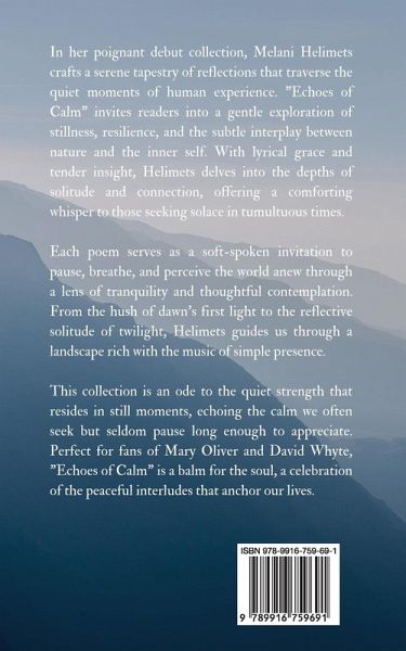 In her poignant debut collection, Melani Helimets crafts a serene tapestry of reflections that traverse the quiet moments of human experience. "Echoes of Calm" invites readers into a gentle exploration of stillness, resilience, and the subtle interplay between nature and the inner self. With lyrical grace and tender insight, Helimets delves into the depths of solitude and connection, offering a comforting whisper to those seeking solace in tumultuous times. Each poem serves as a soft-spoken invitation to pause, breathe, and perceive the world anew through a lens of tranquility and thoughtful contemplation. From the hush of dawn's first light to the reflective solitude of twilight, Helimets guides us through a landscape rich with the music of simple presence. This collection is an ode to the quiet strength that resides in still moments, echoing the calm we often seek but seldom pause long enough to appreciate. Perfect for fans of Mary Oliver and David Whyte, "Echoes of Calm" is a balm for the soul, a celebration of the peaceful interludes that anchor our lives. Copyright © 2024 Book Fairy Publishing