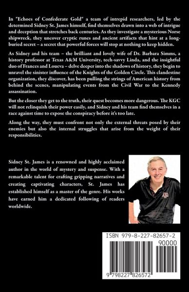 In "Echoes of Confederate Gold" a team of intrepid researchers, led by the determined Sidney St. James himself, find themselves drawn into a web of intrigue and deception that stretches back centuries. As they investigate a mysterious Norse shipwreck, they uncover cryptic runes and ancient artifacts that hint at a long-buried secret - a secret that powerful forces will stop at nothing to keep hidden. As Sidney and his team - the brilliant and lovely wife of Dr. Barbara Simms, a history professor at Texas A&M University, tech-savvy Linda, and the insightful duo of Frances and Loueva - delve deeper into the shadows of history, they begin to unravel the sinister influence of the Knights of the Golden Circle. This clandestine organization, they discover, has been pulling the strings of American history from behind the scenes, manipulating events from the Civil War to the Kennedy assassination. But the closer they get to the truth, their quest becomes more dangerous. The KGC will not relinquish their power easily, and Sidney and his team find themselves in a race against time to expose the conspiracy before it's too late. Along the way, they must confront not only the external threats posed by their enemies but also the internal struggles that arise from the weight of their responsibilities. As they grapple with the moral implications of revealing long-buried truths, they understand the true power of history - and the importance of ensuring that its lessons are never forgotten. "Echoes of Confederate Gold" is a thrilling tale of mystery, adventure, and the fight for truth in a world where the lines between past and present are increasingly blurred. It is a story about the power of knowledge, the importance of preserving our shared history, and the unshakable bonds of friendship and loyalty that can light the way even in the darkest times. As Sidney and his team race to uncover the secrets of America's past, readers will find themselves drawn into a world of hidden agendas, secret societies, and the relentless pursuit of truth against all odds. In the end, "Echoes of Confederate Gold" is a testament to the enduring power of the human spirit - and a reminder that the truth, no matter how deeply buried, has a way of coming to light.