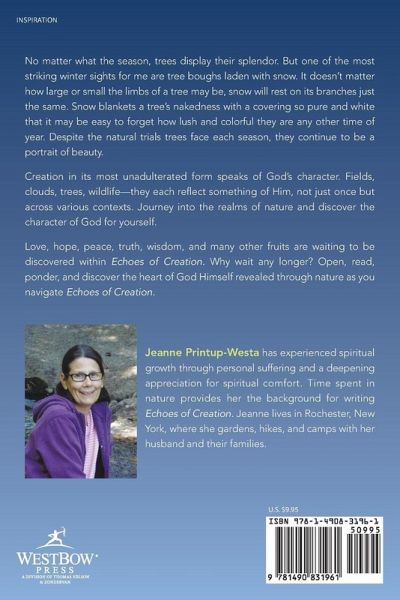 No matter what the season, trees display their splendor. But one of the most striking winter sights for me are tree boughs laden with snow. It doesn't matter how large or small the limbs of a tree may be, snow will rest on its branches just the same. Snow blankets a tree's nakedness with a covering so pure and white that it may be easy to forget how lush and colorful they are any other time of year. Despite the natural trials trees face each season, they continue to be a portrait of beauty. Creation in its most unadulterated form speaks of God's character. Fields, clouds, trees, wildlife-they each reflect something of Him, not just once but across various contexts. Journey into the realms of nature and discover the character of God for yourself. Love, hope, peace, truth, wisdom, and many other fruits are waiting to be discovered within Echoes of Creation. Why wait any longer? Open, read, ponder, and discover the heart of God Himself revealed through nature as you navigate Echoes of Creation.
