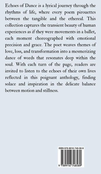 Echoes of Dance is a lyrical journey through the rhythms of life, where every poem pirouettes between the tangible and the ethereal. This collection captures the transient beauty of human experiences as if they were movements in a ballet, each moment choreographed with emotional precision and grace. The poet weaves themes of love, loss, and transformation into a mesmerizing dance of words that resonates deep within the soul. With each turn of the page, readers are invited to listen to the echoes of their own lives reflected in this poignant anthology, finding solace and inspiration in the delicate balance between motion and stillness. Copyright © 2024 Book Fairy Publishing