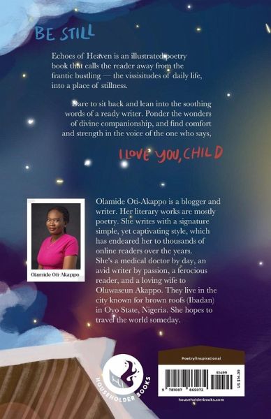 Echoes of Heaven is an illustrated collection of poems that calls the reader away from the frantic bustling - the vicissitudes of daily life, into a place of stillness. Dare to sit back and lean into the soothing words of a ready writer. Each verse of this nine-part, fully illustrated book hopes to call readers to draw from the eternal and divine, strength for daily life. The book comes with a lot of promise and Olamide hopes that through her words, readers will ponder the wonders of divine companionship, and find comfort and strength in the voice of the One who says, "I love you, child." Olamide touches lives with her mind and hands as a physician. She also touches lives with her words. With her ready pen, she has created Echoes of Heaven, a poignant, down-to-earth collection of poems, that, in like manner as the biblical psalms seeks to cast poetic hope into the relatable struggles of every human. In the brokenness of our society today, the light of divine hope and healing still shines brightly. Olamide writes poetry in a simple, yet beautiful and easy-to-comprehend style that will endear voracious readers as well as a new crop of would-be readers of poetry.