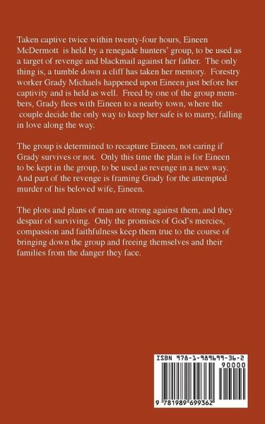 Taken captive twice within twenty-four hours, Eineen McDermott is held by a renegade hunters' group, to be used as a target of revenge and blackmail against her father. The only thing is, a tumble down a cliff has taken her memory. Forestry worker Grady Michaels happened upon Eineen just before her captivity and is held as well. Freed by one of the group members, Grady flees with Eineen to a nearby town, where the couple decide the only way to keep her safe is to marry, falling in love along the way. The group is determined to recapture Eineen, not caring if Grady survives or not. Only this time the plan is for Eineen to be kept in the group, to be used as revenge in a new way. And part of the revenge is framing Grady for the attempted murder of his beloved wife, Eineen. The plots and plans of man are strong against them, and they despair of surviving. Only the promises of God's mercies, compassion and faithfulness keep them true to the course of bringing down the group and freeing themselves and their families from the danger they face.