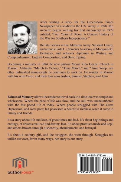 Echoes of Memory allows the reader to travel back to a time that was simple and wholesome. Where the pace of life was slow, and the soul was unencumbered with the fast paced life of today. Where people struggled with The Great Depression, and were poor, but possessed a bountiful richness when it came to family and friends. It's a story about life and love, of good times and bad. It's about beginnings and endings, of dreams realized and dreams lost. It's about promises made and kept, and others broken through dishonesty, abandonment, and betrayal. It's about a country girl, and the struggles…mehr