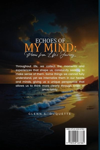 Echoes of My Mind: Poems from Life's Journey by Glenn S. Duquette is a heartfelt collection of poetry that captures the essence of love, loss, resilience, and the simple beauty of life's moments. Through vivid imagery and poignant verses, Duquette reflects on the trials and triumphs of the human spirit, weaving themes of hope, connection, and the enduring power of love. From tender dedications to lost loved ones to lyrical musings on nature, relationships, and personal growth, this collection speaks to the universal experiences that shape us all. Whether you're seeking solace, inspiration, or a deeper understanding of life's complexities, Echoes of My Mind invites you on a journey of introspection and emotional discovery. Perfect for lovers of poetry and those who find comfort in words that resonate with the heart, this book serves as a testament to the power of expression and the enduring strength of the human soul.