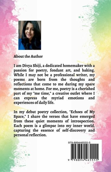 Echoes of My Space My Space: A Journey Towards Self-Discovery Dive into the captivating world of "Echoes of My Space," a poetry collection by Divya Shiji that explores the depths of self-discovery and personal reflection. This anthology weaves together 25 poems, each accompanied by its own unique quotes and reflections, offering readers an intimate glimpse into the poet's inner landscape. What You Will Find Inside: Heartfelt Verses: Poems that resonate with the universal emotions of love, longing, and introspection. Personal Reflections: Insights that deepen the reader's connection to each poem, providing a richer reading experience. Inspirational Themes: A journey through the ups and downs of life, capturing the beauty in both joy and sorrow. About the Author: Divya Shiji, a passionate homemaker and fondant artist, channels her creative spirit into her poetry. Her poems are born from quiet moments of reflection amidst her daily life, blending artistry with heartfelt expression. Why Read "Echoes of My Space"? Authentic Voice: Experience the genuine and unfiltered thoughts of a poet who finds inspiration in everyday life. Emotional Connection: Each poem and reflection is crafted to touch the heart and provoke thought. Beautifully Crafted: Perfect for readers who appreciate the art of poetry and the power of words. Join Divya Shiji on this evocative journey and let "Echoes of My Space" inspire you to explore the echoes within your own life.
