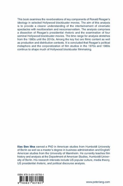 This book examines the reverberations of key components of Ronald Reagan's ideology in selected Hollywood blockbuster movies. The aim of this analysis is to provide a clearer understanding of the intertwinement of cinematic spectacles with neoliberalism and neoconservatism. The analysis comprises a dissection of Reagan's presidential rhetoric and the examination of four seminal Hollywood blockbuster movies. The time range for analysis stretches from the 1980s until the 2010s. Among the key foci are filmic content as well as production and distribution contexts. It is concluded that Reagan's political metaphors and the corporatization of film studios in the 1970s and 1980s continue to shape much of Hollywood blockbuster filmmaking.