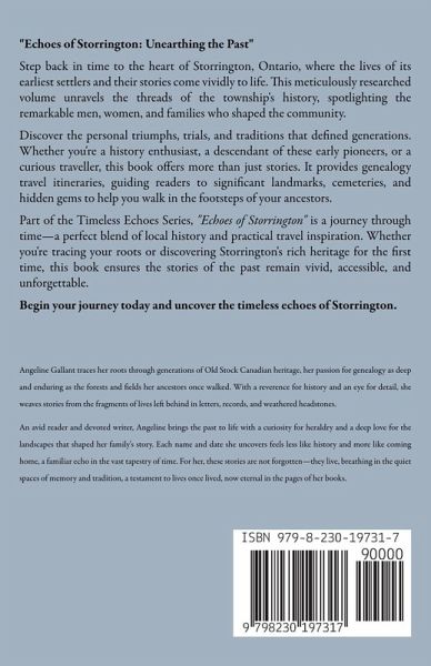 "Echoes of Storrington: Unearthing the Past" Step back in time to the heart of Storrington, Ontario, where the lives of its earliest settlers and their stories come vividly to life. This meticulously researched volume unravels the threads of the township's history, spotlighting the remarkable men, women, and families who shaped the community. Discover the personal triumphs, trials, and traditions that defined generations. Whether you're a history enthusiast, a descendant of these early pioneers, or a curious traveller, this book offers more than just stories. It provides genealogy travel itineraries, guiding readers to significant landmarks, cemeteries, and hidden gems to help you walk in the footsteps of your ancestors. Part of the Timeless Echoes Series, "Echoes of Storrington" is a journey through time-a perfect blend of local history and practical travel inspiration. Whether you're tracing your roots or discovering Storrington's rich heritage for the first time, this book ensures the stories of the past remain vivid, accessible, and unforgettable. Begin your journey today and uncover the timeless echoes of Storrington.