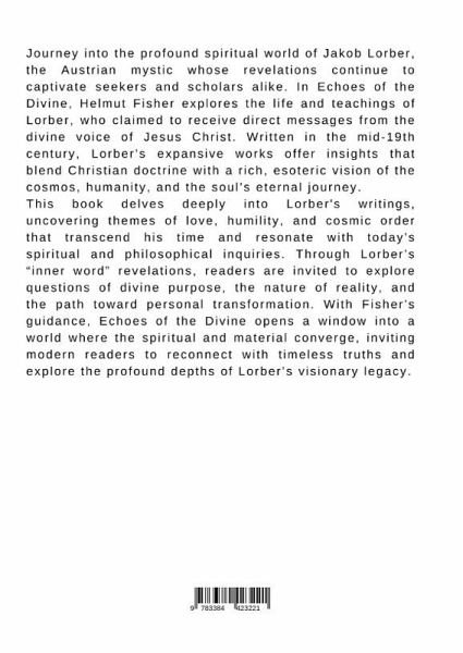 Journey into the profound spiritual world of Jakob Lorber, the Austrian mystic whose revelations continue to captivate seekers and scholars alike. In Echoes of the Divine, Helmut Fisher explores the life and teachings of Lorber, who claimed to receive direct messages from the divine voice of Jesus Christ. Written in the mid-19th century, Lorber's expansive works offer insights that blend Christian doctrine with a rich, esoteric vision of the cosmos, humanity, and the soul's eternal journey.This book delves deeply into Lorber's writings, uncovering themes of love, humility, and cosmic order that transcend his time and resonate with today's spiritual and philosophical inquiries. Through Lorber's "inner word" revelations, readers are invited to explore questions of divine purpose, the nature of reality, and the path toward personal transformation. With Fisher's guidance, Echoes of the Divine opens a window into a world where the spiritual and material converge, inviting modern readers to reconnect with timeless truths and explore the profound depths of Lorber's visionary legacy.