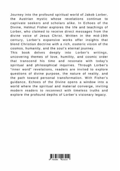 Journey into the profound spiritual world of Jakob Lorber, the Austrian mystic whose revelations continue to captivate seekers and scholars alike. In Echoes of the Divine, Helmut Fisher explores the life and teachings of Lorber, who claimed to receive direct messages from the divine voice of Jesus Christ. Written in the mid-19th century, Lorber's expansive works offer insights that blend Christian doctrine with a rich, esoteric vision of the cosmos, humanity, and the soul's eternal journey.This book delves deeply into Lorber's writings, uncovering themes of love, humility, and cosmic order that transcend his time and resonate with today's spiritual and philosophical inquiries. Through Lorber's "inner word" revelations, readers are invited to explore questions of divine purpose, the nature of reality, and the path toward personal transformation. With Fisher's guidance, Echoes of the Divine opens a window into a world where the spiritual and material converge, inviting modern readers to reconnect with timeless truths and explore the profound depths of Lorber's visionary legacy.