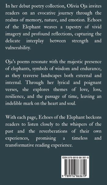 In her debut poetry collection, Olivia Oja invites readers on an evocative journey through the realms of memory, nature, and emotion. Echoes of the Elephant weaves a tapestry of vivid imagery and profound reflections, capturing the delicate interplay between strength and vulnerability. Oja's poems resonate with the majestic presence of elephants, symbols of wisdom and endurance, as they traverse landscapes both external and internal. Through her lyrical and poignant verses, she explores themes of love, loss, resilience, and the passage of time, leaving an indelible mark on the heart and soul. With each page, Echoes of the Elephant beckons readers to listen closely to the whispers of the past and the reverberations of their own experiences, promising a timeless and transformative reading experience. Copyright (c) 2024 Swan Charm Publishing