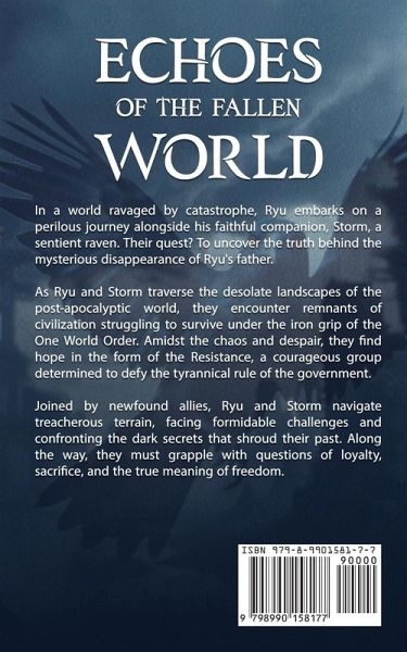 In a world ravaged by catastrophe, Ryu embarks on a perilous journey alongside his faithful companion, Storm, a sentient raven. Their quest? To uncover the truth behind the mysterious disappearance of Ryu's father. As Ryu and Storm traverse the desolate landscapes of the post-apocalyptic world, they encounter remnants of civilization struggling to survive under the iron grip of the One World Order. Amidst the chaos and despair, they find hope in the form of the Resistance, a courageous group determined to defy the tyrannical rule of the government. Joined by newfound allies, Ryu and Storm navigate treacherous terrain, facing formidable challenges and confronting the dark secrets that shroud their past. Along the way, they must grapple with questions of loyalty, sacrifice, and the true meaning of freedom. As the Resistance's battle against the One World Order intensifies, Ryu and Storm are thrust into the heart of the conflict, where they must summon all their courage and strength to confront the powers that seek to control their world. In a thrilling tale of survival, resilience, and the enduring power of hope, "Echoes of The Fallen World" paints a vivid portrait of a dystopian future where the bonds of friendship and the quest for truth may be the only weapons against oppression.