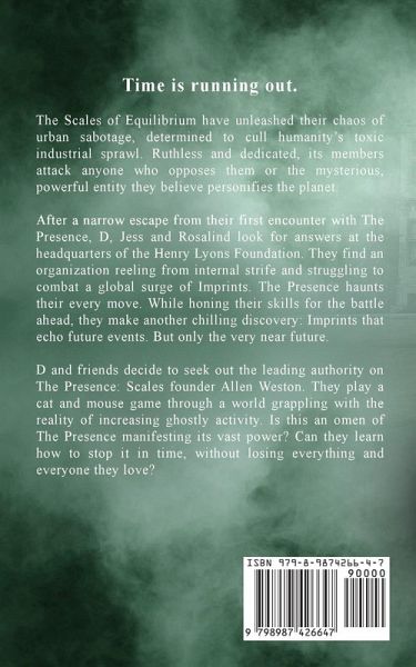 Time is running out. The Scales of Equilibrium have unleashed their chaos of urban sabotage, determined to cull humanity's toxic industrial sprawl. Ruthless and dedicated, its members attack anyone who opposes them or the mysterious, powerful entity they believe personifies the planet. After a narrow escape from their first encounter with The Presence, D, Jess and Rosalind look for answers at the headquarters of the Henry Lyons Foundation. They find an organization reeling from internal strife and struggling to combat a global surge of Imprints. The Presence haunts their every move. While honing their skills for the battle ahead, they make another chilling discovery: Imprints that echo future events. But only the very near future. D and friends decide to seek out the leading authority on The Presence: Scales founder Allen Weston. They play a cat and mouse game through a world grappling with the reality of increasing ghostly activity. Is this an omen of The Presence manifesting its vast power? Can they learn how to stop it in time, without losing everything and everyone they love?