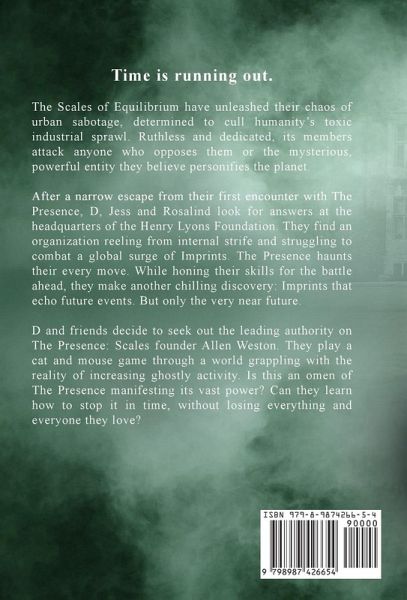 Time is running out. The Scales of Equilibrium have unleashed their chaos of urban sabotage, determined to cull humanity's toxic industrial sprawl. Ruthless and dedicated, its members attack anyone who opposes them or the mysterious, powerful entity they believe personifies the planet. After a narrow escape from their first encounter with The Presence, D, Jess and Rosalind look for answers at the headquarters of the Henry Lyons Foundation. They find an organization reeling from internal strife and struggling to combat a global surge of Imprints. The Presence haunts their every move. While honing their skills for the battle ahead, they make another chilling discovery: Imprints that echo future events. But only the very near future. D and friends decide to seek out the leading authority on The Presence: Scales founder Allen Weston. They play a cat and mouse game through a world grappling with the reality of increasing ghostly activity. Is this an omen of The Presence manifesting its vast power? Can they learn how to stop it in time, without losing everything and everyone they love?