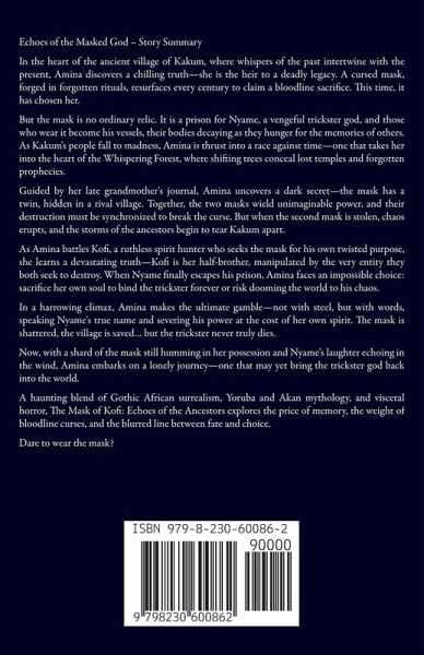 Echoes of the Masked God - Story Summary In the heart of the ancient village of Kakum, where whispers of the past intertwine with the present, Amina discovers a chilling truth-she is the heir to a deadly legacy. A cursed mask, forged in forgotten rituals, resurfaces every century to claim a bloodline sacrifice. This time, it has chosen her. But the mask is no ordinary relic. It is a prison for Nyame, a vengeful trickster god, and those who wear it become his vessels, their bodies decaying as they hunger for the memories of others. As Kakum's people fall to madness, Amina is thrust into a race against time-one that takes her into the heart of the Whispering Forest, where shifting trees conceal lost temples and forgotten prophecies. Guided by her late grandmother's journal, Amina uncovers a dark secret-the mask has a twin, hidden in a rival village. Together, the two masks wield unimaginable power, and their destruction must be synchronized to break the curse. But when the second mask is stolen, chaos erupts, and the storms of the ancestors begin to tear Kakum apart. As Amina battles Kofi, a ruthless spirit hunter who seeks the mask for his own twisted purpose, she learns a devastating truth-Kofi is her half-brother, manipulated by the very entity they both seek to destroy. When Nyame finally escapes his prison, Amina faces an impossible choice: sacrifice her own soul to bind the trickster forever or risk dooming the world to his chaos. In a harrowing climax, Amina makes the ultimate gamble-not with steel, but with words, speaking Nyame's true name and severing his power at the cost of her own spirit. The mask is shattered, the village is saved... but the trickster never truly dies. Now, with a shard of the mask still humming in her possession and Nyame's laughter echoing in the wind, Amina embarks on a lonely journey-one that may yet bring the trickster god back into the world. A haunting blend of Gothic African surrealism, Yoruba and Akan mythology, and visceral horror, The Mask of Kofi: Echoes of the Ancestors explores the price of memory, the weight of bloodline curses, and the blurred line between fate and choice. Dare to wear the mask?