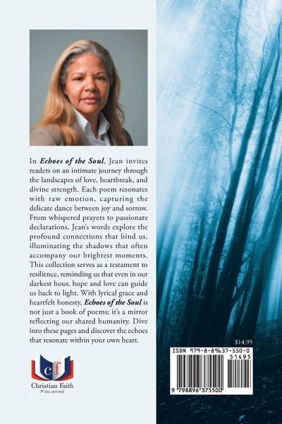 In Echoes of the Soul, Jean invites readers on an intimate journey through the landscapes of love, heartbreak, and divine strength. Each poem resonates with raw emotion, capturing the delicate dance between joy and sorrow. From whispered prayers to passionate declarations, Jean's words explore the profound connections that bind us, illuminating the shadows that often accompany our brightest moments. This collection serves as a testament to resilience, reminding us that even in our darkest hour, hope and love can guide us back to light. With lyrical grace and heartfelt honesty, Echoes of the Soul is not just a book of poems; it's a mirror reflecting our shared humanity. Dive into these pages and discover the echoes that resonate within your own heart.