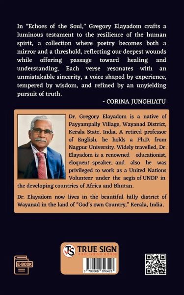 In "Echoes of the Soul," Gregory Elayadom crafts a luminous testament to the resilience of the human spirit, a collection where poetry becomes both a mirror and a threshold, reflecting our deepest wounds while offering passage toward healing and understanding. Each verse resonates with an unmistakable sincerity, a voice shaped by experience, tempered by wisdom, and refined by an unyielding pursuit of truth.- CORINA JUNGHIATUDr. Gregory Elayadom is a native of Payyampally Village, Wayanad District, Kerala State, India. A retired professor of English, he holds a Ph.D. from Nagpur University. Widely travelled, Dr. Elayadom is a renowned educationist, eloquent speaker, and also he was privileged to work as a United Nations Volunteer under the aegis of UNDP inthe developing countries of Africa and Bhutan.Dr. Elayadom now lives in the beautiful hilly district of Wayanad in the land of "God's own Country," Kerala, India.