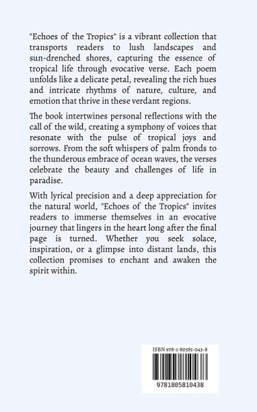 "Echoes of the Tropics" is a vibrant collection that transports readers to lush landscapes and sun-drenched shores, capturing the essence of tropical life through evocative verse. Each poem unfolds like a delicate petal, revealing the rich hues and intricate rhythms of nature, culture, and emotion that thrive in these verdant regions. The book intertwines personal reflections with the call of the wild, creating a symphony of voices that resonate with the pulse of tropical joys and sorrows. From the soft whispers of palm fronds to the thunderous embrace of ocean waves, the verses celebrate the beauty and challenges of life in paradise. With lyrical precision and a deep appreciation for the natural world, "Echoes of the Tropics" invites readers to immerse themselves in an evocative journey that lingers in the heart long after the final page is turned. Whether you seek solace, inspiration, or a glimpse into distant lands, this collection promises to enchant and awaken the spirit within.