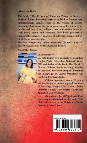 The book "The Echoes of Victorian Poetry in Selected Works of Robert Browning" written by Dr. Ritu Pandey very metaphorically defines some of the works of Robert Browning, that shows his poetic powers and his maturity in intellectual love of art, religion, men and women invested with color, music and romance. Her book presents a memorable character analysis of different poems, full of incisive and acute insight. She has categorically talked about the changes in social order brought about by the change in Politics.