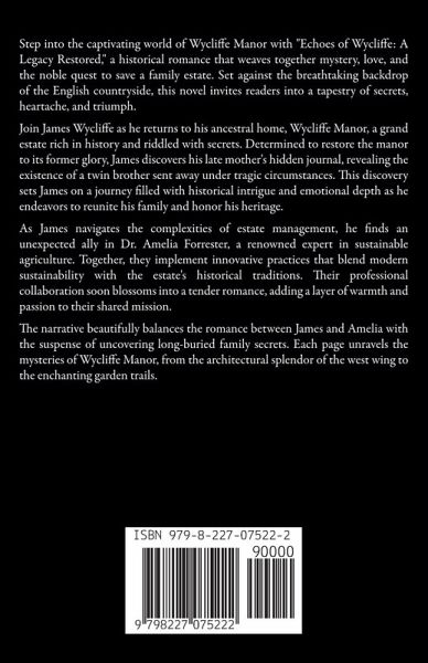 Step into the captivating world of Wycliffe Manor with "Echoes of Wycliffe: A Legacy Restored," a historical romance that weaves together mystery, love, and the noble quest to save a family estate. Set against the breathtaking backdrop of the English countryside, this novel invites readers into a tapestry of secrets, heartache, and triumph. Join James Wycliffe as he returns to his ancestral home, Wycliffe Manor, a grand estate rich in history and riddled with secrets. Determined to restore the manor to its former glory, James discovers his late mother's hidden journal, revealing the existence of a twin brother sent away under tragic circumstances. This discovery sets James on a journey filled with historical intrigue and emotional depth as he endeavors to reunite his family and honor his heritage. As James navigates the complexities of estate management, he finds an unexpected ally in Dr. Amelia Forrester, a renowned expert in sustainable agriculture. Together, they implement innovative practices that blend modern sustainability with the estate's historical traditions. Their professional collaboration soon blossoms into a tender romance, adding a layer of warmth and passion to their shared mission. The narrative beautifully balances the romance between James and Amelia with the suspense of uncovering long-buried family secrets. Each page unravels the mysteries of Wycliffe Manor, from the architectural splendor of the west wing to the enchanting garden trails.