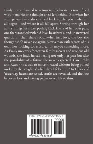 Emily never planned to return to Blackwater, a town filled with memories she thought she'd left behind. But when her aunt passes away, she's pulled back to the place where it all began-and where it all fell apart. Sorting through her aunt's things feels like peeling back layers of her own past, one that's tangled with old love, heartbreak, and unanswered questions. Then there's Ryan-her first love, the boy she thought she'd never see again. Now a man with regrets of his own, he's looking for closure... or maybe something more. As Emily uncovers forgotten family secrets and reopens old wounds, she finds herself facing not only her past but also the possibility of a future she never expected. Can Emily and Ryan find a way to move forward without being pulled under by the weight of what they left behind? In Echoes of Yesterday, hearts are tested, truths are revealed, and the line between love and letting go has never felt so thin.
