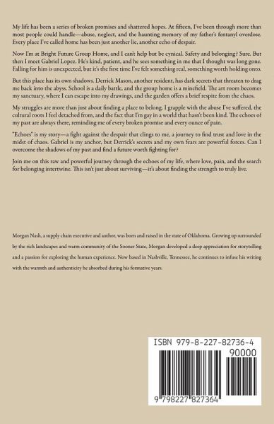 My life has been a series of broken promises and shattered hopes. At fifteen, I've been through more than most people could handle-abuse, neglect, and the haunting memory of my father's fentanyl overdose. Every place I've called home has been just another lie, another echo of despair. Now I'm at Bright Future Group Home, and I can't help but be cynical. Safety and belonging? Sure. But then I meet Gabriel Lopez. He's kind, patient, and he sees something in me that I thought was long gone. Falling for him is unexpected, but it's the first time I've felt something real, something worth holding onto. But this place has its own shadows. Derrick Mason, another resident, has dark secrets that threaten to drag me back into the abyss. School is a daily battle, and the group home is a minefield. The art room becomes my sanctuary, where I can escape into my drawings, and the garden offers a brief respite from the chaos. My struggles are more than just about finding a place to belong. I grapple with the abuse I've suffered, the cultural roots I feel detached from, and the fact that I'm gay in a world that hasn't been kind. The echoes of my past are always there, reminding me of every broken promise and every ounce of pain. "Echoes" is my story-a fight against the despair that clings to me, a journey to find trust and love in the midst of chaos. Gabriel is my anchor, but Derrick's secrets and my own fears are powerful forces. Can I overcome the shadows of my past and find a future worth fighting for? Join me on this raw and powerful journey through the echoes of my life, where love, pain, and the search for belonging intertwine. This isn't just about surviving-it's about finding the strength to truly live.