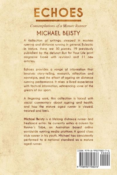 Retired from full-time employment in January 2020. Currently engaged in freelance writing as a pastime. Mature aged distance runner. A collection of 30 articles/pieces. It provides a range of information that involves story-telling, factual research, reflection mixed with nostalgia, and the effect of aging on distance running performance. It's flavor is more about entertaining the reader, being topical, while attempting to deliver underlying messages and some limited social narrative. It's not meant to be a collection of scientific research essays. The collection is eclectic. Each piece is very different and tends to stand on its own. While often centering on the master's experience the articles have broader application to the general running population, men and women.