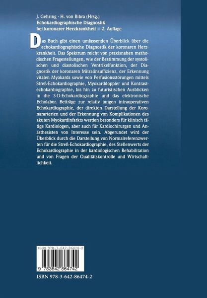 Echokardiographische Diagnostik bei koronarer Herzkrankheit.- Quantitative versus qualitative Beurteilung der linksventrikulären Funktion - Praktikabilität und Limitationen.- Methoden zur Verbesserung der Endokarderkennung.- Diastolische Ventrikelfunktion.- Intraoperative Echokardiographie bei Patienten mit koronarer Herzkrankheit.- Koronare Mitralinsuffizienz.- Infarktkomplikationen - echokardiographische Diagnostik und therapeutische Relevanz.- Linksventrikuläre Thromben.- Echokardiographische Koronardiagnostik - Koronarvisualisierung und funktionelle Perfusionsanalyse.- Methodik der Streßechokardiographie.- Streßechokardiographische Normalwerte der globalen und regionalen linksventrikulären Funktion.- Streßechokardiographie nach akutem Myokardinfarkt - therapeutische Relevanz, prognostische Aussagen.- Methoden zur Erkennung vitalen Myokards.- Stellenwert der Streßechokardiographie in der kardiologischen Rehabilitation.- Physikalische Grundlagen und Limitationen der Myokard-Kontrast-echokardiographie.- Myokard-Kontrastechokardiographie: Experimentelle Ergebnisse und klinisches Potential.- Myokard-Doppler bei koronarer Herzkrankheit.- Qualitätskontrolle und Wirtschaftlichkeit.- Das digitale Echokardiographielabor.