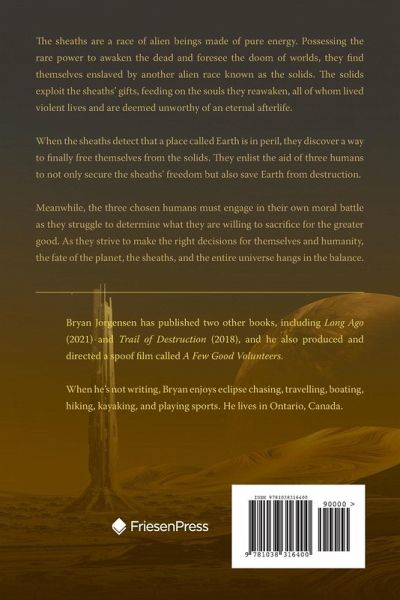 The sheaths are a race of alien beings made of pure energy. Possessing the rare power to awaken the dead and foresee the doom of worlds, they find themselves enslaved by another alien race known as the solids. The solids exploit the sheaths' gifts, feeding on the souls they reawaken, all of whom lived violent lives and are deemed unworthy of an eternal afterlife. When the sheaths detect that a place called Earth is in peril, they discover a way to finally free themselves from the solids. They enlist the aid of three humans to not only secure the sheaths' freedom but also save Earth from destruction. Meanwhile, the three chosen humans must engage in their own moral battle as they struggle to determine what they are willing to sacrifice for the greater good. As they strive to make the right decisions for themselves and humanity, the fate of the planet, the sheaths, and the entire universe hangs in the balance.