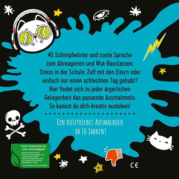 Schimpfwörter und coole Sprüche zum Abreagieren und Wutrauslassen. Zu jeder ärgerlichen Gelegenheit findet sich hier das passende Ausmalmotiv. So kann man sich kreativ austoben!
