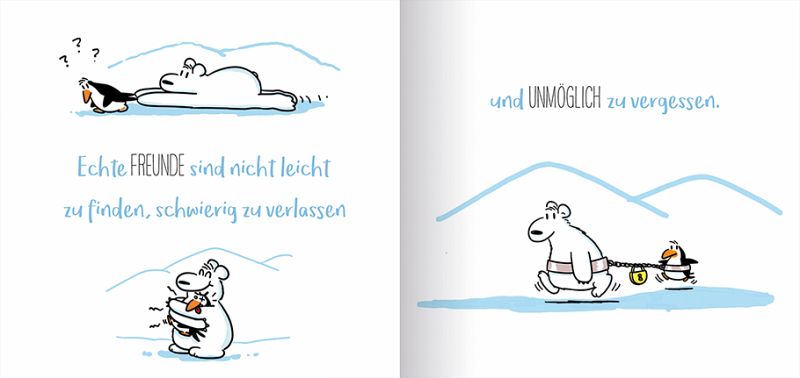 Zum Thema Freundschaft schickt er in diesem kompakten Geschenkbüchlein nun zwei drollige Best Buddies ins Cartoon-Rennen: einen kleinen Pinguin und einen starken Eisbären. Auf zahlreichen Seiten stehlen die bezaubernden Illustrationen fast den begleitenden Texten die Show. Aber nur fast, denn gerade die sorgfältig ausgewählten Worte in diesem Buch sind es, die einen guten Freund oder eine gute Freundin erreichen und berühren sollen.