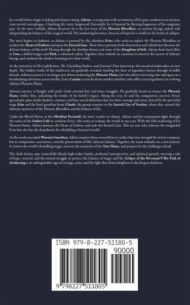 In a world where magic is fading and chaos is rising, Adrian, a young man with no memory of his past, awakens in an ancient, rune-carved sarcophagus. Clutching the runic longsword Dawnlight, he is haunted by fleeting fragments of his enigmatic past. As the story unfolds, Adrian discovers he is the last scion of the Phoenix Bloodline, an ancient lineage tasked with safeguarding the balance of the magical world. His awakening becomes a beacon of hope for a world on the brink of collapse. The story begins in darkness, as Adrian is pursued by the relentless Evira, who seeks to exploit the Phoenix Bloodline to awaken the Heart of Embers and open the Eternal Gate. These forces promise both destruction and rebirth but threaten the delicate balance of life itself. Fleeing through the desolate forests and ruins of the Kingdom of Isth, Adrian finds loyal allies in Lina, a skilled ranger, and Holt, a reformed cultist. Together, they embark on a journey to uncover the secrets of Adrian's lineage and confront the shadow looming over their world. As the narratives of The Lightbearers, The Unyielding Embers, and External Time intertwine, this mystical realm takes on new depth. The hidden truths of the multiverse are gradually revealed, binding the fates of legendary heroes through invisible threads. Adrian's journey is no longer just about awakening the Phoenix Flame, but also about traversing time and space in a breathtaking adventure across worlds. Enter Cassius, a traveler from another timeline, who offers crucial guidance in evolving Adrian's Phoenix Flame. Adrian's journey is fraught with peril-both external foes and inner struggles. He gradually learns to master the Phoenix Flame within him, unlocking the truths of his family's legacy. Along the way, he and his companions uncover Evira's apocalyptic plan, battle shadowy enemies, and face moral dilemmas that test their courage and unity. Joined by the powerful mage Erin and the loyal guardian beast Claude, the group ventures to the Sacred City of Verolan, where they unravel the ultimate mysteries of the Phoenix Bloodline and the balance of life. Under the Blood Moon, at the Obsidian Pyramid, the story reaches its climax. Adrian and his companions fight through the ranks of the Ember Cult to confront Evira, who seeks to reshape the world at any cost. With the full awakening of his Phoenix Flame, Adrian destroys the Heart of Embers and seals the Eternal Gate. This act not only redeems the misguided Evira but also lays the foundation for rebuilding a fractured world. As the newly ascended Phoenix Guardian, Adrian inspires those around him to realize that true strength lies not in conquest, but in compassion, coexistence, and the preservation of life's delicate balance. Together, the team embarks on a new journey to restore the world's dwindling magic, uncover the mysteries of the True Flame, and prepare for the challenges ahead. This dark fantasy epic masterfully blends high-stakes battles, profound introspection, and spiritual growth, weaving a tale of hope, renewal, and the eternal struggle to protect the balance of magic and life. Eclipse of the Revenant¿The Path of Awakening is an unforgettable saga of courage, unity, and the light that shines brightest in the deepest darkness.
