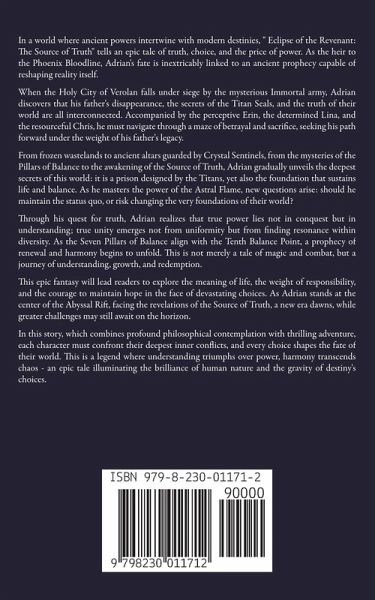 In a world where ancient powers intertwine with modern destinies, " Eclipse of the Revenant: The Source of Truth" tells an epic tale of truth, choice, and the price of power. As the heir to the Phoenix Bloodline, Adrian's fate is inextricably linked to an ancient prophecy capable of reshaping reality itself. When the Holy City of Verolan falls under siege by the mysterious Immortal army, Adrian discovers that his father's disappearance, the secrets of the Titan Seals, and the truth of their world are all interconnected. Accompanied by the perceptive Erin, the determined Lina, and the resourceful Chris, he must navigate through a maze of betrayal and sacrifice, seeking his path forward under the weight of his father's legacy. From frozen wastelands to ancient altars guarded by Crystal Sentinels, from the mysteries of the Pillars of Balance to the awakening of the Source of Truth, Adrian gradually unveils the deepest secrets of this world: it is a prison designed by the Titans, yet also the foundation that sustains life and balance. As he masters the power of the Astral Flame, new questions arise: should he maintain the status quo, or risk changing the very foundations of their world? Through his quest for truth, Adrian realizes that true power lies not in conquest but in understanding; true unity emerges not from uniformity but from finding resonance within diversity. As the Seven Pillars of Balance align with the Tenth Balance Point, a prophecy of renewal and harmony begins to unfold. This is not merely a tale of magic and combat, but a journey of understanding, growth, and redemption. This epic fantasy will lead readers to explore the meaning of life, the weight of responsibility, and the courage to maintain hope in the face of devastating choices. As Adrian stands at the center of the Abyssal Rift, facing the revelations of the Source of Truth, a new era dawns, while greater challenges may still await on the horizon. In this story, which combines profound philosophical contemplation with thrilling adventure, each character must confront their deepest inner conflicts, and every choice shapes the fate of their world. This is a legend where understanding triumphs over power, harmony transcends chaos - an epic tale illuminating the brilliance of human nature and the gravity of destiny's choices.