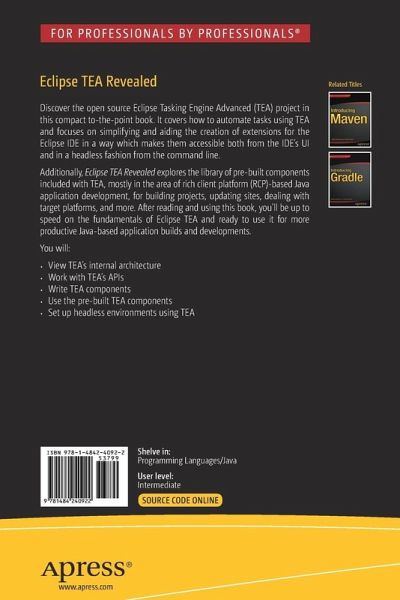Discover the open source Eclipse Tasking Engine Advanced (TEA) project in this compact to-the-point book. It covers how to automate tasks using TEA and focuses on simplifying and aiding the creation of extensions for the Eclipse IDE in a way which makes them accessible both from the IDE's UI and in a headless fashion from the command line.