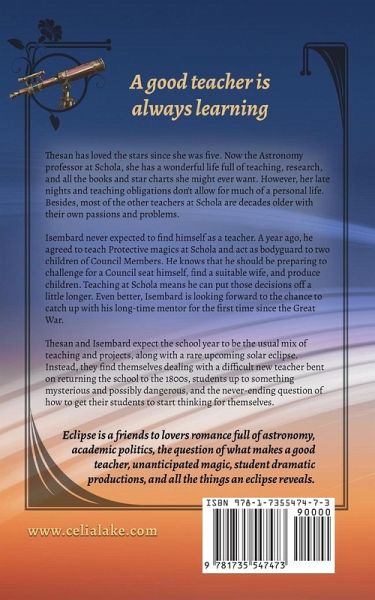 A good teacher is always learning something new. Thesan has loved the stars since she was five. Now the Astronomy professor at Schola, she has a wonderful life full of teaching, research, and all the books and star charts she might ever want. However, her late nights and teaching obligations don't allow for much of a personal life. Besides, most of the other teachers at Schola are decades older with their own passions and problems. Isembard never expected to find himself as a teacher. A year ago, he agreed to teach Protective magics at Schola and act as bodyguard to two children of Council Members. He knows that he should be preparing to challenge for a Council seat himself, find a suitable wife, and produce children. Teaching at Schola means he can put those decisions off a little longer. Even better, Isembard is looking forward to the chance to catch up with his long-time mentor for the first time since the Great War. Thesan and Isembard expect the school year to be the usual mix of teaching and projects, along with a rare upcoming solar eclipse. Instead, they find themselves dealing with a difficult new teacher bent on returning the school to the 1800s, students up to something mysterious and possibly dangerous, and the never-ending question of how to get their students to start thinking for themselves. Eclipse is a friends to lovers romance full of astronomy, academic politics, the question of what makes a good teacher, unanticipated magic, student dramatic productions, and all the things an eclipse reveals. Set in 1924 and 1925 at a magical school off the coast of Wales, Eclipse is 110,000 words with a happily-ever-after ending.