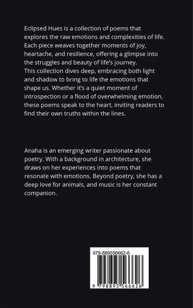 Eclipsed Hues is a heartfelt collection of poems that explores the raw emotions and complexities of life. Each piece weaves together moments of joy, heartache, and resilience, offering a glimpse into the struggles and beauty of life's journey. This collection dives deep into embracing both light and shadow to bring to life the emotions that shape us all. Whether it's a quiet moment of introspection or a flood of overwhelming emotion, these poems speak to the heart, inviting readers to find their own truths within the lines.