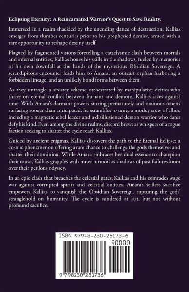 Eclipsing Eternity: A Reincarnated Warrior's Quest to Save Reality. Immersed in a realm shackled by the unending dance of destruction, Kallias emerges from slumber centuries prior to his prophesied demise, armed with a rare opportunity to reshape destiny itself. Plagued by fragmented visions foretelling a cataclysmic clash between mortals and infernal entities, Kallias hones his skills in the shadows, fueled by memories of his own downfall at the hands of the mysterious Obsidian Sovereign. A serendipitous encounter leads him to Amara, an outcast orphan harboring a forbidden lineage, and an unlikely bond forms between them. As they untangle a sinister scheme orchestrated by manipulative deities who thrive on eternal conflict between humans and demons, Kallias races against time. With Amara's dormant powers stirring prematurely and ominous omens surfacing sooner than anticipated, he scrambles to unite a motley crew of allies, including a magnetic rebel leader and a disillusioned demon warrior who dares defy his kind. Even among the divine realms, discord brews as whispers of a rogue faction seeking to shatter the cycle reach Kallias. Guided by ancient enigmas, Kallias discovers the path to the Eternal Eclipse: a cosmic phenomenon offering a rare chance to challenge the gods themselves and shatter their dominion. While Amara embraces her dual essence to champion their cause, Kallias grapples with inner turmoil as shadows of past failures loom over their perilous odyssey. In an epic clash that breaches the celestial gates, Kallias and his comrades wage war against corrupted spirits and celestial entities. Amara's selfless sacrifice empowers Kallias to vanquish the Obsidian Sovereign, rupturing the gods' stranglehold on humanity. The cycle is sundered at last, but not without profound sacrifice.